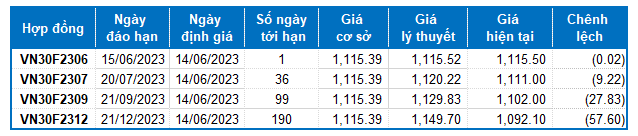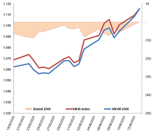 Các hợp đồng tương lai đồng loạt tăng điểm trong phiên giao dịch ngày 13/06/2023. Cụ thể, VN30F2306 (F2306) tăng 0.65%, đạt 1,115.50 điểm; VN30F2307 (F2307) tăng 0.47%, đạt 1,111.00 điểm; hợp đồng VN30F2309 (F2309) tăng 0.92%, đạt 1,102.00 điểm; hợp đồng VN30F2312 (F2312) tăng 0.6% và đạt 1,092.10 điểm. Chỉ số cơ sở VN30-Index kết phiên ở mức 1,115.39 điểm.