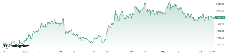 Trong 6 tháng, giá vàng thế giới đã tăng khoảng 6,5%. Đơn vị: USD/oz.