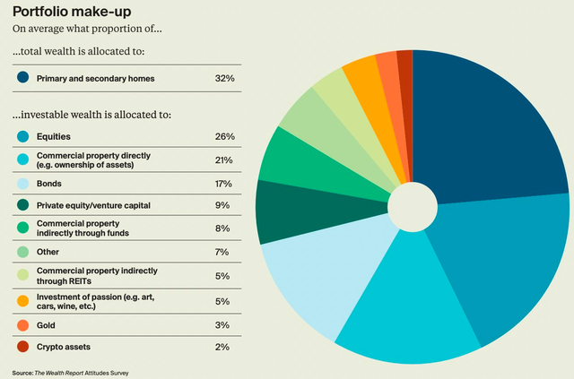 Khảo sát của Knight Frank cũng liệt kê các khoản đầu tư "khác", chiếm trung bình khoảng 7% danh mục đầu tư của nhóm người siêu giàu trên thế giới, nhưng lại không nói rõ danh mục này bao gồm những gì.