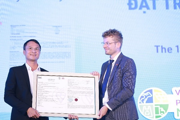 Ông Nguyễn Việt Dũng – Giám đốc Bureau Veritas Việt Nam trao chứng nhận trung hòa carbon cho lãnh đạo trang trại bò sữa Vinamilk tại Nghệ An.