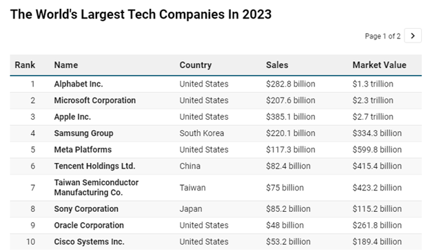 Số lượng công ty công nghệ lọt vào Global 2000 2023, Bảng xếp hạng hàng năm của Forbes về các công ty lớn nhất thế giới (dựa trên doanh thu, lợi nhuận, tài sản và giá trị thị trường chứng khoán), đã tăng từ 164 (năm 2022) lên 169 trong năm nay. Tuy nhiên, con số này vẫn chưa thể đạp đổ kỷ lục 177 công ty công nghệ nằm trong BXH vào năm 2021. Tuy nhiên, các công ty công nghệ trong danh sách Global 2000 vẫn đạt doanh thu hàng năm kỷ lục 4,2 nghìn tỷ USD trong 12 tháng qua, tăng từ gần 4 nghìn tỷ USD (năm 2022) và hơn 3,3 nghìn tỷ USD (năm 2021).