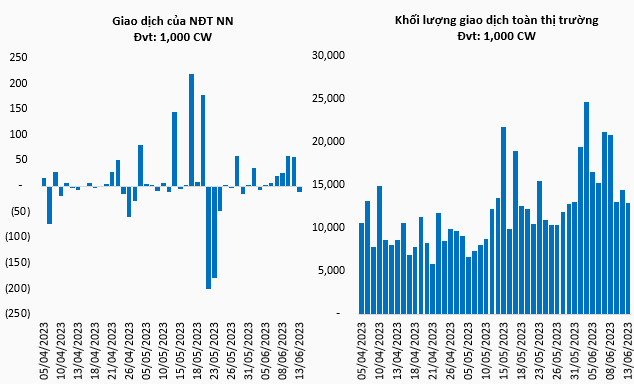 Khối ngoại quay lại bán ròng trong phiên 13/06 với tổng mức bán ròng đạt 11,100 CW. Trong đó, CHPG2306 và CMWG2214 là hai mã bị bán ròng nhiều nhất.