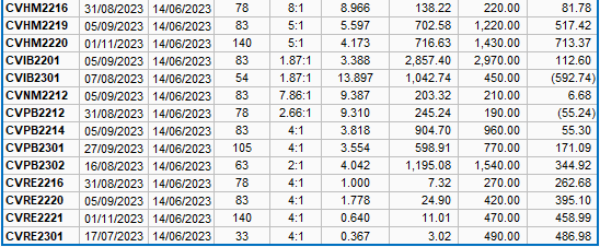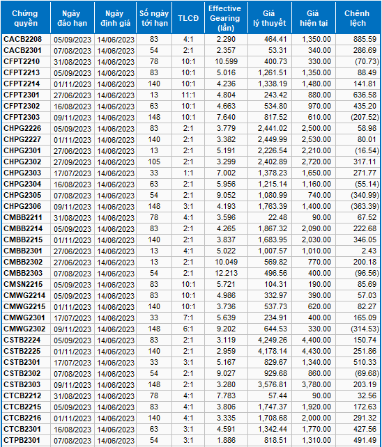 Dựa trên phương pháp định giá phù hợp với thời điểm khởi đầu là ngày 14/06/2023, mức giá hợp lý của các chứng quyền đang được giao dịch trên thị trường được thể hiện như sau: