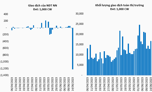 Khối ngoại tiếp tục bán ròng trong phiên 14/06 với tổng mức bán ròng đạt 1,223,700 CW. Trong đó, CVNM2301 và CTPB2302 là hai mã bị bán ròng nhiều nhất.