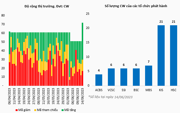 Công ty chứng khoán HSC hiện đang là tổ chức phát hành có nhiều mã chứng quyền nhất thị trường với 21 mã, theo sau là KIS với 21 mã, MBS với 7 mã, BSC với 6 mã, SSI với 6 mã, VCSC với 6 mã, ACBS với 4 mã, PHS với 1 mã.