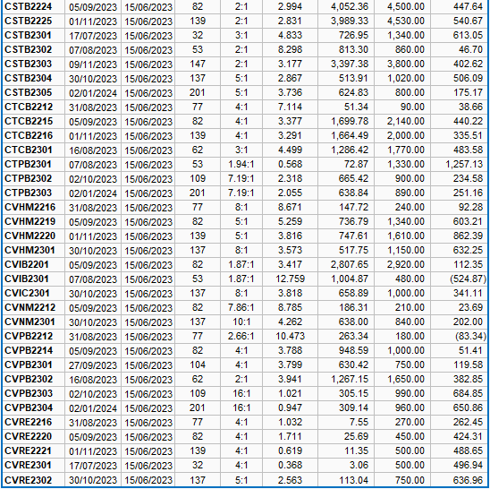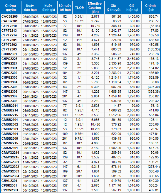 Dựa trên phương pháp định giá phù hợp với thời điểm khởi đầu là ngày 15/06/2023, mức giá hợp lý của các chứng quyền đang được giao dịch trên thị trường được thể hiện như sau: