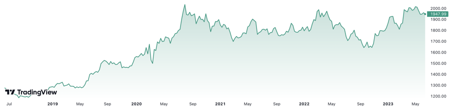 Trong 5 năm, giá vàng thế giới đã tăng hơn 50%. Đơn vị: USD/oz.