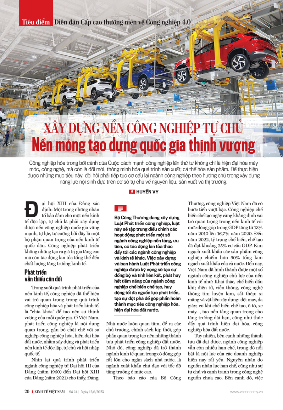 Đại hội XIII của Đảng xác định: Một trong những nhân tố bảo đảm cho một nền kinh tế độc lập, tự chủ là phải xây dựng được nền công nghiệp quốc gia vững mạnh, tự lực, tự cường bởi đây là một bộ phận quan trọng của nền kinh tế quốc dân. Công nghiệp phát triển không những tạo ra giá trị gia tăng cao mà còn tác động lan tỏa tổng thể đến chất lượng tăng trưởng kinh tế.